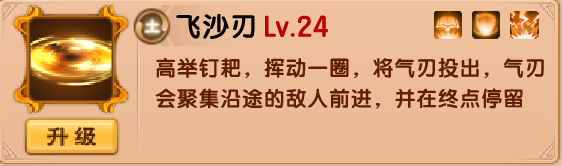 高举钉耙,挥动一圈,将气刃投出,气刃会聚集沿途的敌人前进,并在终点停留。可以用来聚怪和推开boss,如果前一个飞沙刃还在的时候使用第二次飞沙刃,第一次的会跟着第二次扔出的方向位移一小段距离。加点建议:前期适合低加点打控制和攒无双1-3级,后期蓝多了可以点到满冷却。