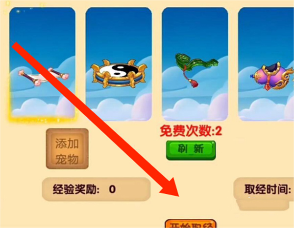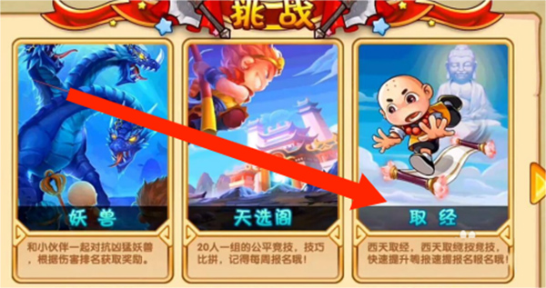 3、在【挑战模式】中选择【取经】,可以帮助宠物和角色快速提升等级,
