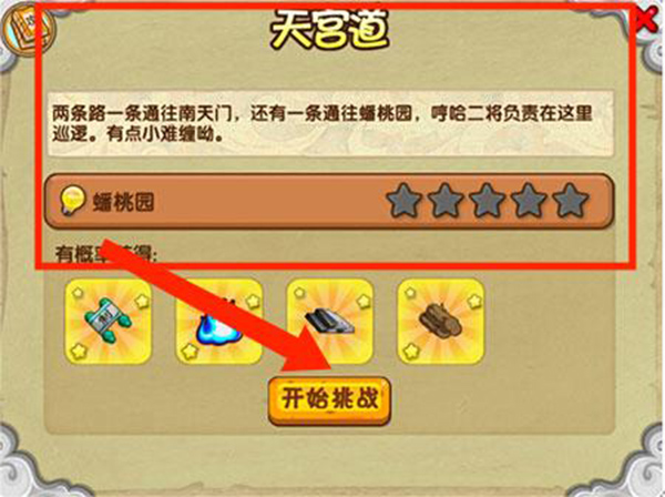 2、打开开放中的地图,目前有【天宫道】的“蟠桃园”和【北天王殿】的“御马监”这两张地图才能捕捉宠物,这里我们以【蟠桃园】为例,选择【开始挑战】选项,