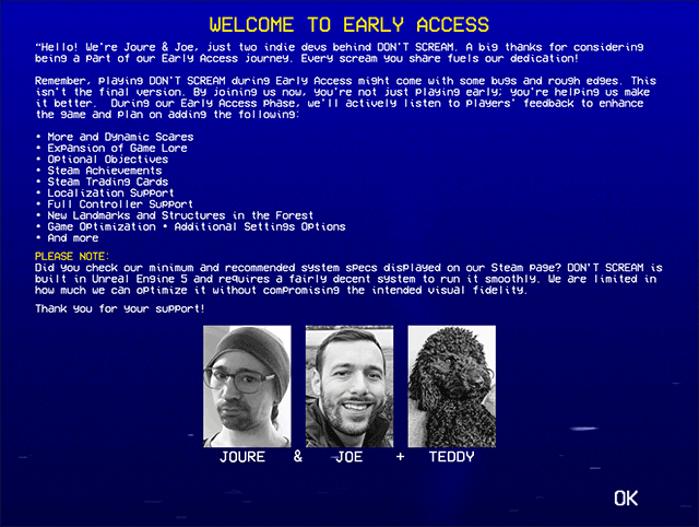 如果您尖叫,就要重新开始。这里小编为你带来了请勿尖叫恐怖游戏,也叫切勿尖叫,不要尖叫,英文名称DON'T SCREAM,是由两名独立开发人员Joure和Joe制作的虚幻5恐怖短篇游戏,玩家将挑战在不尖叫的情况下探索森林18分钟,在这么短的时间内,玩家们会因为森林中什么样的恐怖而发出声音呢?只有当玩家在真实移动时,时间才会出现流逝,玩家必须尽最大的努力,控制好自己的发声。如果你喜欢一款足够挑战自我控制能力的恐怖冒险游戏的话,这款游戏非常值得您的下载体验。