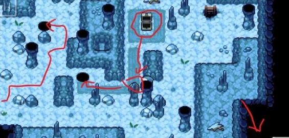 还是第三层,最下面那个冰场一开始是过不去的,走右边那个梯子,上去之后就有个箱子,技能换成:推,按图示把石头推下去才能过关第三层那个冰场。