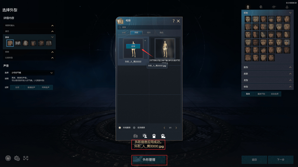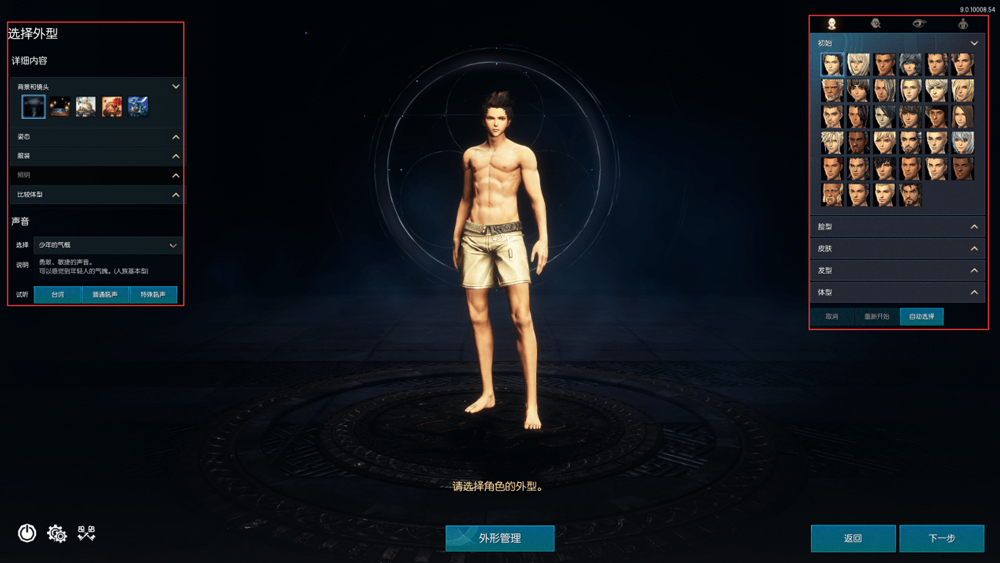 4、进入到外形管理界面(以下称为捏脸),到达捏脸界面后玩家可以选择角色的声音、体型、发型、脸部细节等二十几个部位的精细调节