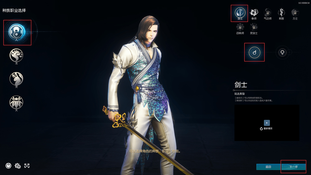 3、种族、职业、性别选择成功后(如图示,人族,男,剑士职业)点击下一步