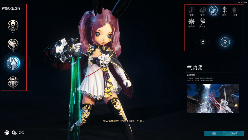 2、点击创建后进入种族选择与职业选择界面,剑灵有四大种族,分别为人族、龙族、灵族与天族,不同的种族有不同的职业限制,如灵族只能选择气功师、刺客、召唤师与灵剑士。