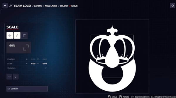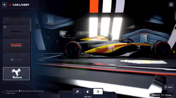 选定赞助商后,您可以在汽车的各个区域应用他们的徽标。选择赞助商和位置后,您可以编辑徽标的确切位置以及颜色、比例和旋转,以便更好地控制其品牌在汽车上的呈现方式。这种控制还扩展到赞助商在车队制服上出现的位置和方式。
