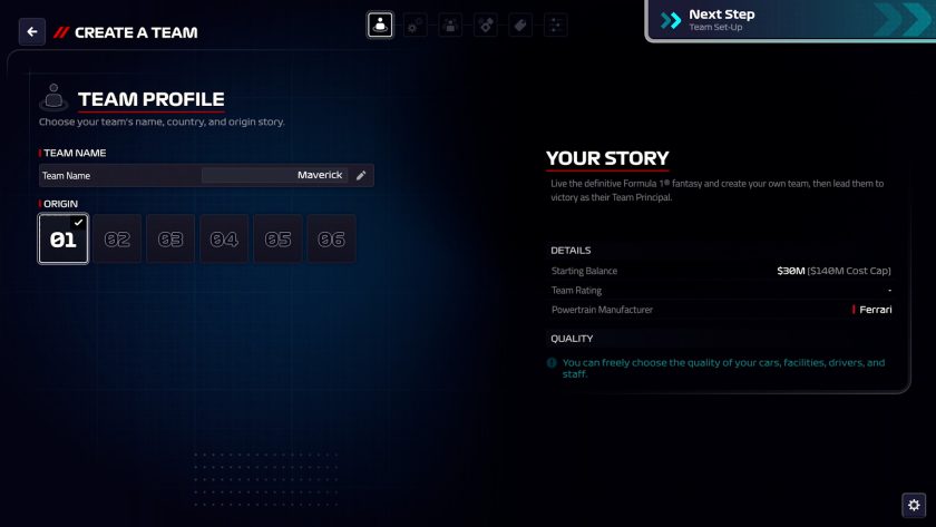 创建团队让您能够组建自己梦想中的自定义 F1 团队。无论是新晋竞争对手、传承前赛车巨头历史 DNA 的团队,还是资金雄厚的超级制造商,创建团队都为您提供了一系列深度定制选项,帮助您组建终极梦幻 F1 团队