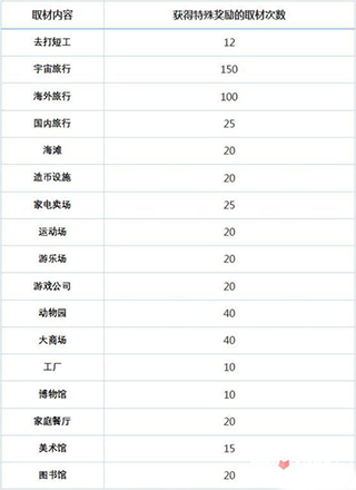 可以看出表中选哪个要获得特殊奖励,取材的次数也都有变化的,所以建议大家能够更快的获得奖励,就时刻观察取材的地点,避免重复浪费时间。