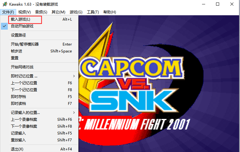 3、最后点击“文件”载入游戏,接着按照以下①②③④步骤依次进行即可运行“拳皇2001”游戏。
