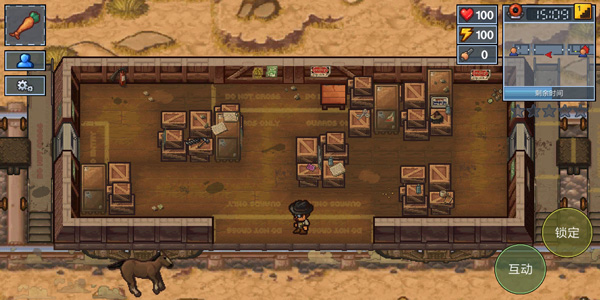二、然后到从左开始倒数第二个车厢的下方(有只马),手握胡萝卜即可越狱,找遍全部箱子,找到如下图材料,两个撬棍一个胶带卷,合成钩子,