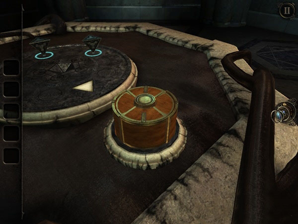 这次冒险又从投影机的房间回到水台上,一切谜题源于三棱体魔盒。与上次一样,将获得的新三棱体魔盒放置于白色三角形位置上,随后便会在泥水中冒出一个精致的机关盒子,就这样游戏的 Chapter 2 迎来第一道谜题。