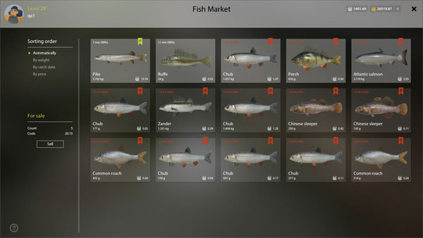 奖杯鱼以更高的价格出售。尝试捕捉和出售大鱼,它会带来更多的钱。在一天之前被捕获的腐烂的鱼,价值很低。