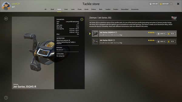 要购买货物,您需要在钓鱼基地上找到商店,然后去门上按下交互按钮[E]。在打开的窗口中,选择所需的部分并在列表中找到感兴趣的产品。用鼠标左键[LMB]单击该项目打开详细信息窗口,您可以在其中找到该项目的所有可能版本以及有关该项目的更多详细信息。
