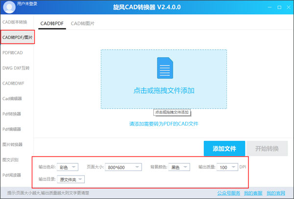 这个功能主要就是用来将CAD文件转换成PDF或图片格式,下面就是设置输出色彩、页面大小、背景颜色、输出质量等,同样点击开始转换按钮即可。