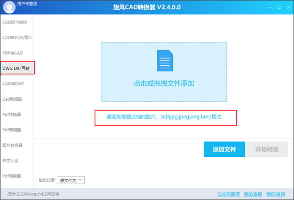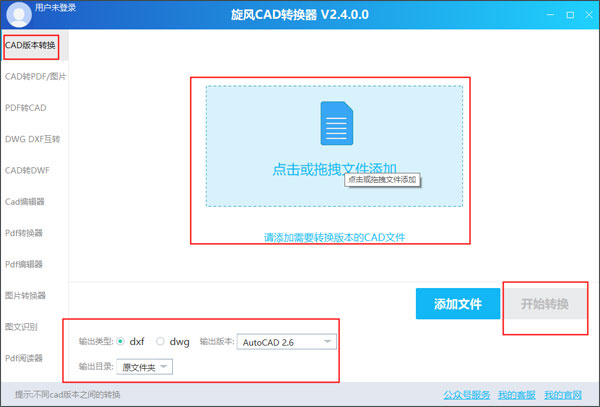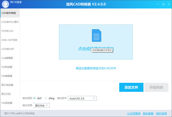 打开软件之后,用鼠标靠近“点击或拖拽文件添加”,选择好需要换货版本的CAD文件。选择好之后,设置左下方的输出类型、输出版本以及输出目录,最后点击开始转换。