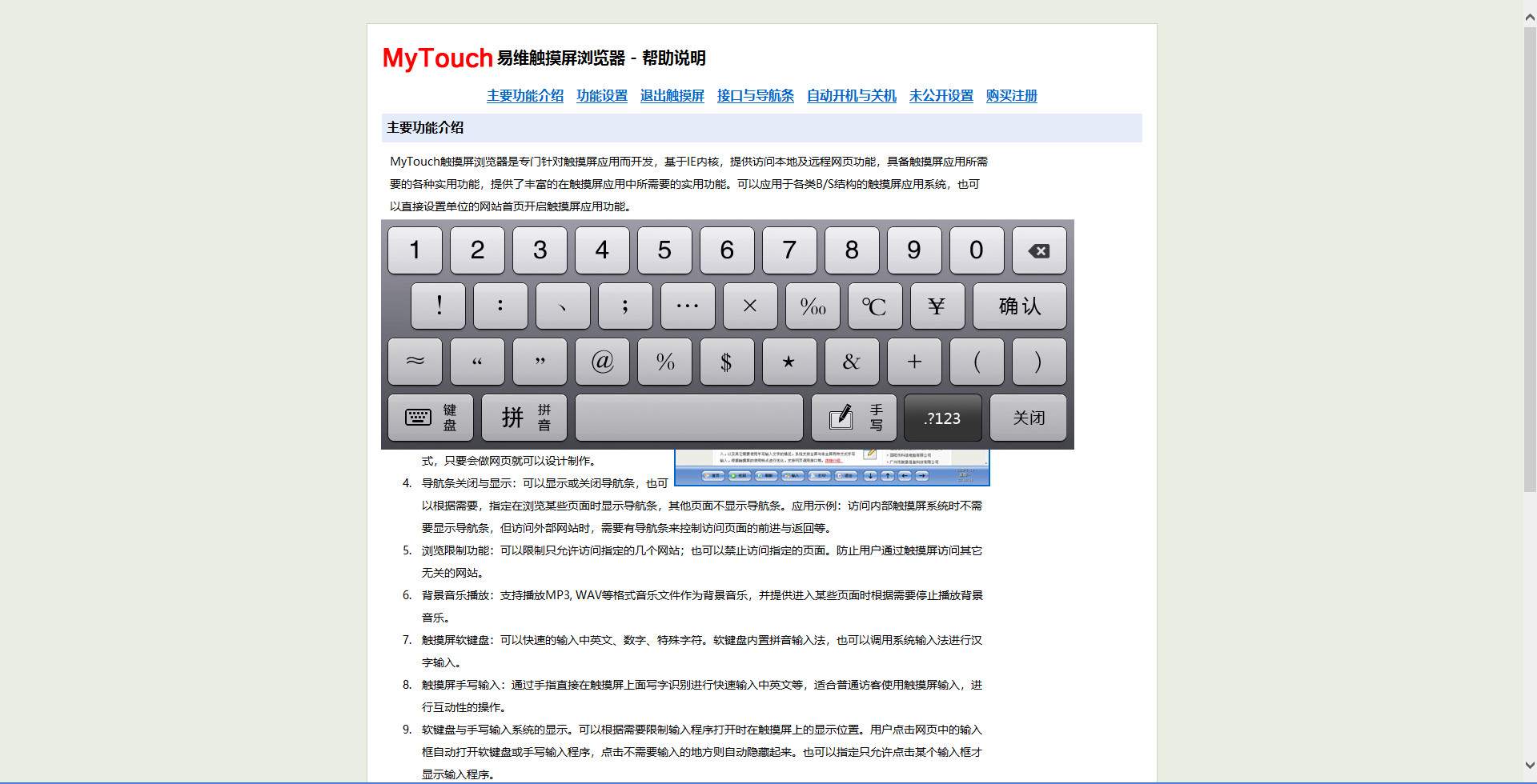 MyTouch触摸屏浏览器需要运行在win2000/winxp/win2003/vista/win7/win8/win10系统,能够支持触摸屏浏览导航,支持触摸屏软键盘,支持触摸屏手写输入,还可以限制浏览功能,用户可以自行限制只允许访问指定的几个网站,以及屏蔽系统热键,可以保证系统的安全性。