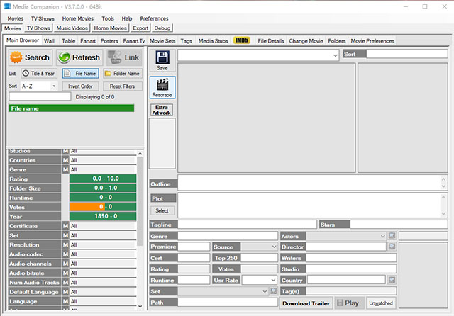 Media Companion是来自一款功能强大的影视媒体管理工具。该软件功能页面精美,功能非常丰富,而且操作十分简单。它能够自动从Internet中收集您所需要的媒体信息,如:海报,背景,情节摘要,演员和演员图片,评分等,并以有组织的方式向您提供这些信息。不仅如此,在软件中,我们可以将电影按照电影的不同类型来进行分类调整,这样就可以非常快速的找到自己喜欢的电影进行观看,以便管理。总的来说,喜欢看电影的朋友一定不要错过这款软件!!!