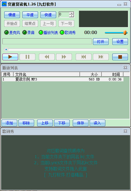 通过与mp3文件对应的lrc字幕文件,可以实现逐句复读和字幕显示功能。