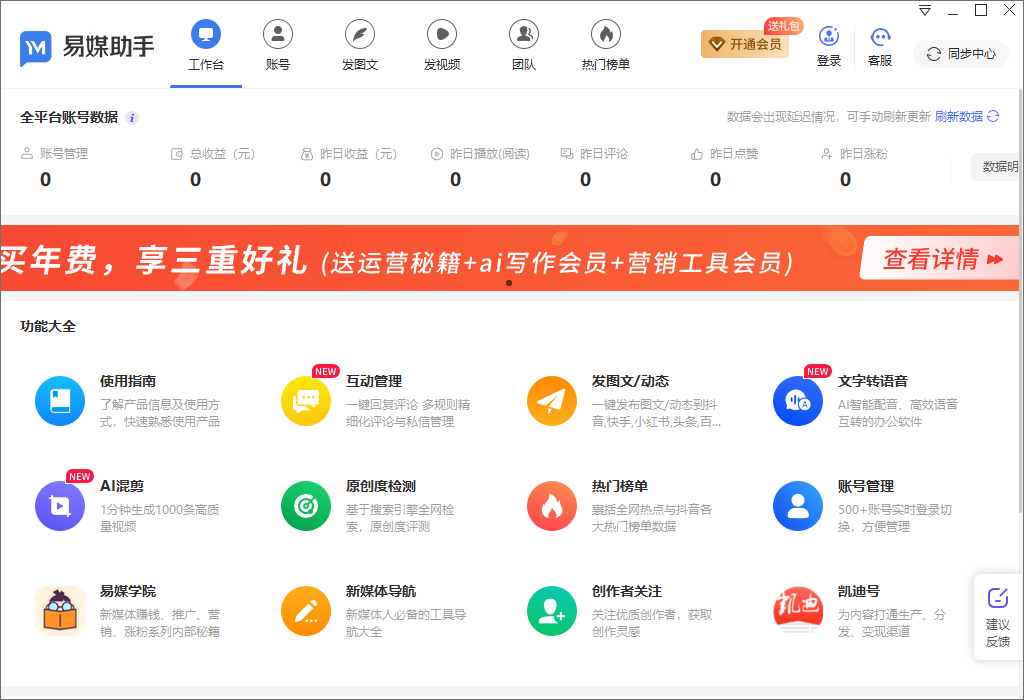 如果你还在被自媒体管理、创作、分发等问题烦恼,那小编推荐你试试易媒助手官方版,这是一款功能强大、专业实用的新媒体高效综合运营工具,可帮助用户一键将图片、视频、文章等内容发送至40+平台,轻松告别机械重复,快速提升百分之八十效率。