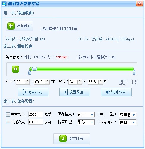3 、多次试听满意后,这时你就可以点击界面上方的保存铃声了,这里有三个选择: