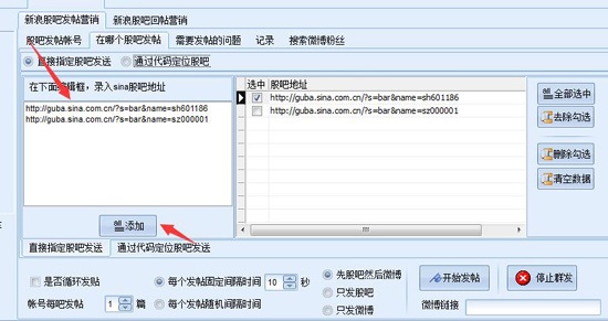 默认是在指定股吧发帖,这个界面可以录入股吧地址,然后加入发送列表。