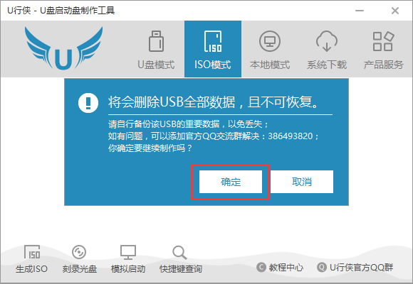 2、这个会弹出一个警告窗口,告知用户 “ 制作前请务必做好数据备份,否则将会丢失”,请确认USB设备中数据是否另行备份,确认完成后直接点击 “ 确定” 按钮,如下图所示: