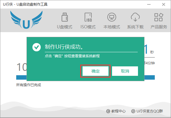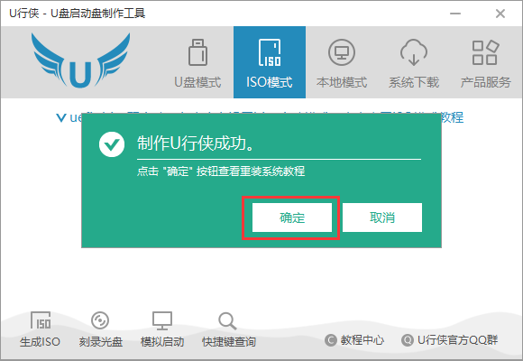 4、制作成功后会弹出一个窗口,告知用户 “ 制作U行侠成功”,到这里,U行侠已经完全制作成功,此时点击 “ 确定” 按钮,可以查看重装系统的相关教程,如下图所示:
