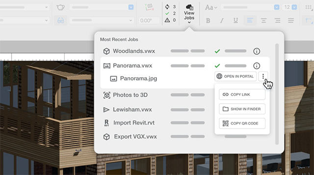 无需离开主桌面应用程序即可享受Vectorworks云服务的所有好处。Vectorworks视图栏中的新“云状态”小部件为您提供实时云处理更新、作业进度和直接访问结果。消除应用程序之间的来回切换,使您能够保持专注、同步和高效。