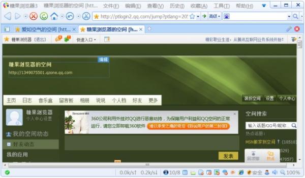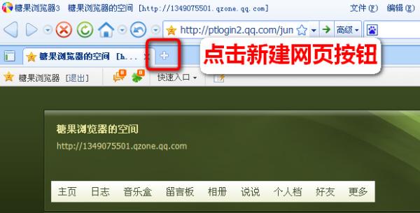 只需要通过新建网页登录QQ空间,或者点击QQ里的空间按钮(需将糖果浏览器设为默认浏览器),就可以在同一浏览器中打开多个QQ空间