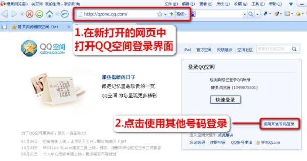 在新打开的网页中打开QQ空间的登录界面(http://qzone.qq.com),然后点击使用其他号码登录。