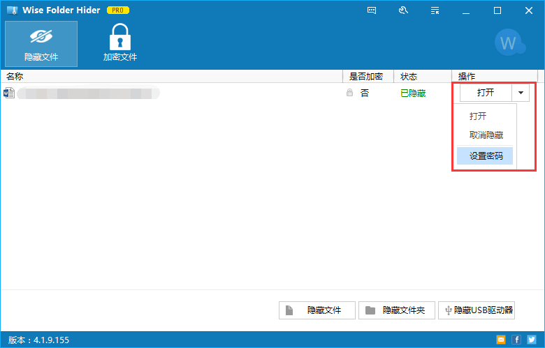 在每个已隐藏的项目后面有一个操作菜单,可以轻松实现“打开”,“取消隐藏”和“设置密码”。