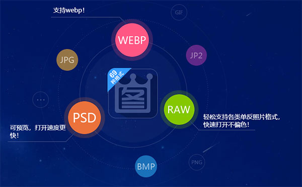 除了支持JPG/BMP/PNG常见图片格式和GIF/TIF动画格式,还支持PSD/RAW/WEBP/JP2等专业格式。