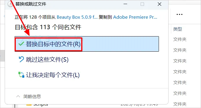 点击【替换目标中的文件】;