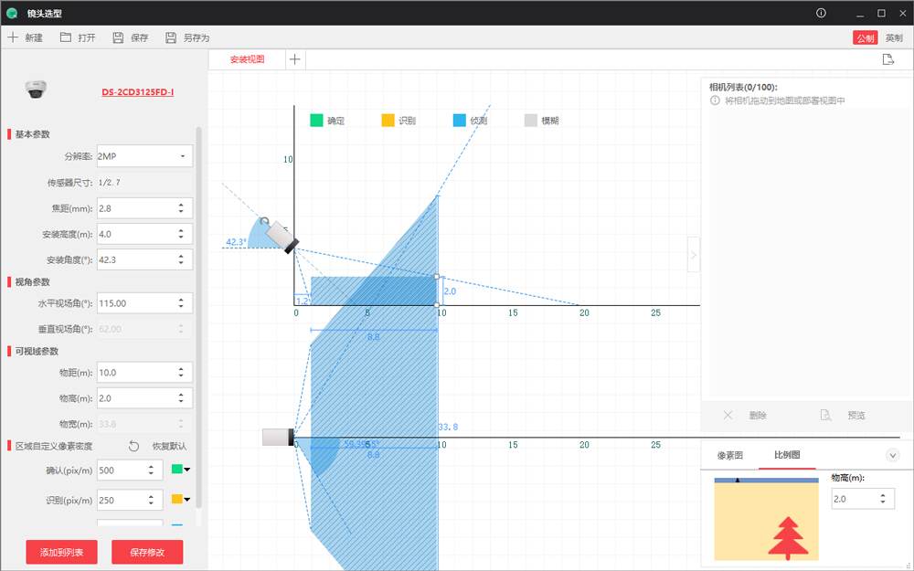镜头选型电脑版是一款方便实用,绿色免费的相机镜头选型助手工具,可为用户提供摄像机安装和使用人员筛选相机、计算镜头相关参数、规划监控场景等功能。您能够根据视野大小和精度要求能直接计算出需要相机的像素要求,完美支持格局视野大小和相机行列像素个数计算醋相机的像素精度,有效帮助用户进行工作,轻松面对难题,而且使用该工具,用户还可以方便筛选出相机和镜头,然后进行安装高度、安装角度等设置,查看成像效果,有需求的用户可在此点击下载!