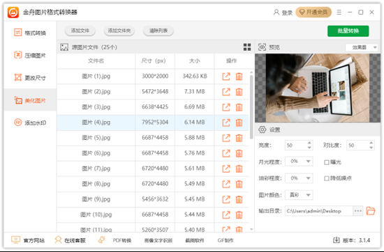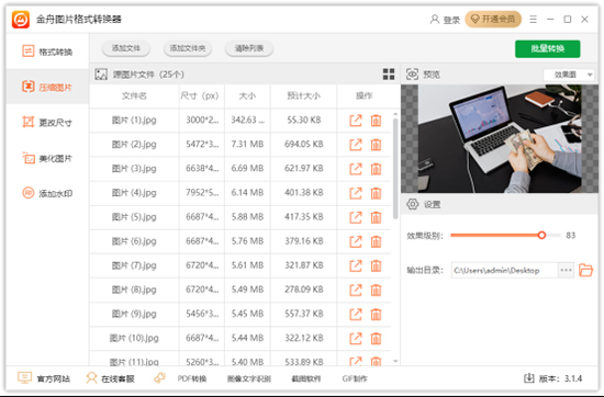 金舟图片格式转换器是一款界面简单、功能强大的图片转换工具,不仅支持图片一键批量处理,同时拥有效果预览、图片格式转换、图片尺寸更改、图片美化、图片添加水印等功能,能真正为广大用户提升工作生活效率。在软件中,一键批量压缩图片大小非常方便,在右侧效果等级中往右拖动即可,数值越大图片压缩得越小。而当图片尺寸太大时,用户可选择更改图片尺寸,大小可根据比例或者尺寸大小更改,其中还支持旋转图片角度。而提供的美化图片功能,在设置中也可根据自己需求调整,并且在上方还有对应的预览效果,只为让用户观看更清晰。同时,添加水印功能支持两种水印类型,分别是文字和图片,操作起来也特别简单,只需设置中选择水印类型就可以了。