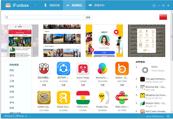 iFunbox-Store分 "应用商店" 和 "游戏中心" 两大模块,iFunbox-Store将根据您喜爱玩的游戏或感兴趣的应用,为你推荐更多新,奇,特的应用。有一些优秀的应用或许是因为小成本苦于没有广告推广费,难以展示在大众面前,iFunbox发现这些应用,并让它们展示在大众眼前。只要好玩的,我们会为您逐一挖掘出来~iFunbox-Store有34个不同国家地区的应用推荐哦!