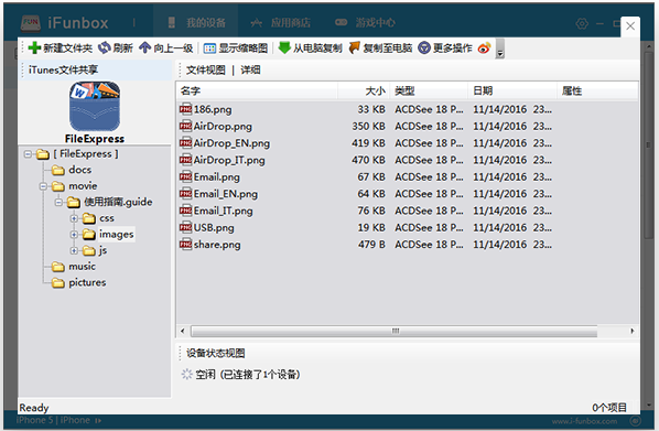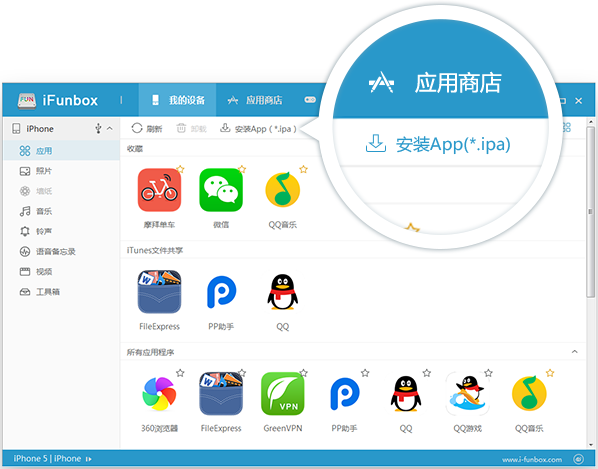 使用iFunbox的快速功能入口可以轻松管理设备中的应用,照片,音乐,手机铃声,视频和语音备忘录,从此对你的多媒体文件一览无余。