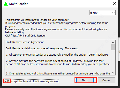 2、首先点击dmitriRender_5.0.0.1.exe,选择同意条款继续安装;