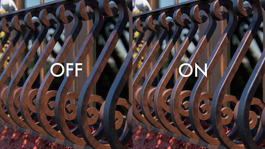 “天空光” 是一款先进的日光模拟器,用于柔化和分散场景的环境光。它与“柔和阴影”和“精致细节阴影”结合使用,增强了这些元素的真实相互作用。观看树叶和树木变得逼真,发现人物、建筑物和景观突然变得更符合其所在环境。