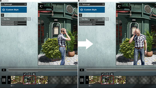 一只海鸥在错误的时刻飞过,一个动画人的手臂神秘地撞到了大楼的正面。使用 Lumion 8 的新时间扭曲效果,您可以用时间偏移来改变动画人物、动物和对象的小动作。向后或向前切换时间。您的动画对象现在会调整其位置,以在正确的时间准确地摆出正确的姿势。