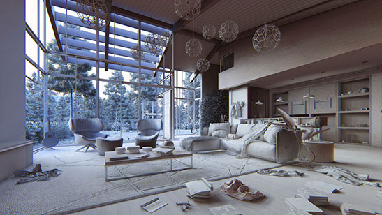 ·T这些具有细致纹理贴图的材料是观众“摸到”墙壁、“闻到”客厅沙发的皮革和“听到”脚在地板上移动的声音的秘密因素。