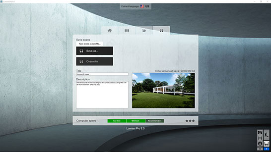 在 Lumion 8 中,新的和改进的保存屏幕和对话框功能让您更容易组织您的场景文件到正确的文件夹中。检索或更新您的项目时确保您的文件存储在您想要的地方,无论是在您的计算机上还是在网络上。