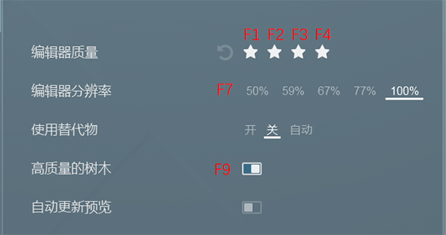 2、当你的植物过多,造成场景卡顿的时候,可以在设置里面通过调整编辑器的质量来降低场景品质。F1是最低档,这个模式下的品质质感,比较劣质,相当于5毛特效。