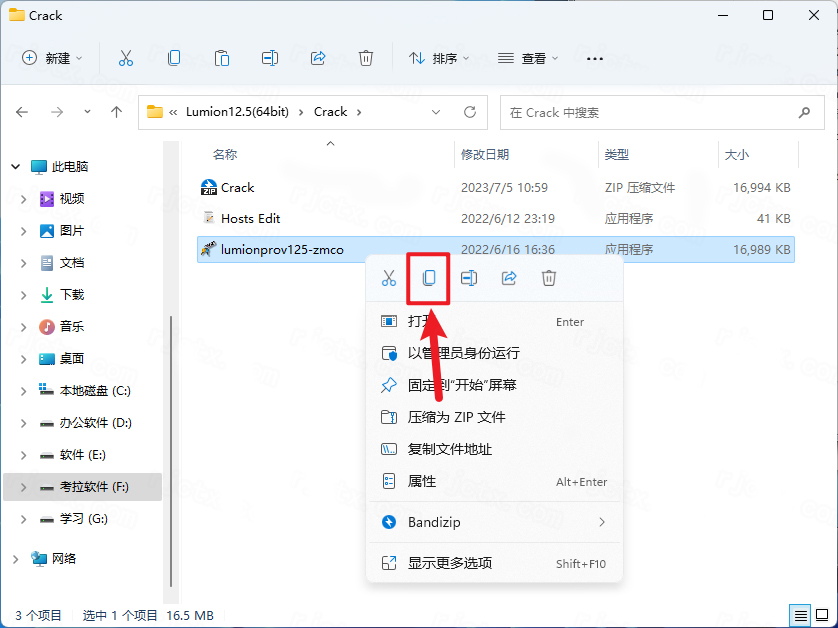5、打开Crack文件夹将其解压,鼠标右击【lumionprov125-zmco】注册机,点击【复制】