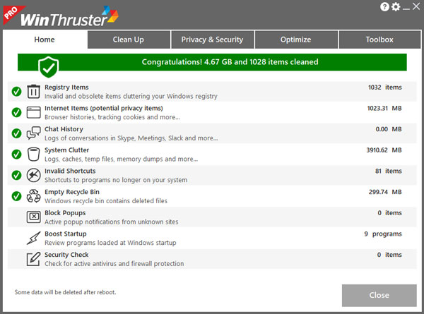 个人计算机变慢问题的最大的原因之一与您的计算机在启动时自动加载的程序数量有关。如果您在系统托盘(您的屏幕底部的 Windows 条,包含当日时间)中看到若干图标,则有可能您在启动时加载太多程序。WinThruster 为您提供可以轻松管理启动项的一个实用程序,从而修复这个问题。您只要按几下,就可以停用或启用启动时加载的任何程序。