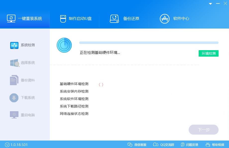 2、软件首先会检测系统环境-〉选择系统-〉备份资料-〉下载系统-〉重启电脑-〉重装完成。