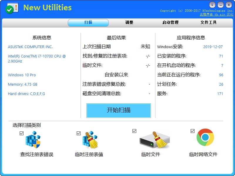 New Utilities是一款功能十分强大的系统管理工具,它是您每天必用的电脑系统清理优化调整软件。它支持修复注册表问题、清理注册表、删除临时文件、调整Windows、管理开机启动项目等。修复系统错误,清理和调整您的计算机,使您的计算机在最佳状态下工作。文件工具允许您按条件查找文件,在Office和记事本文件中查找敏感信息,粉碎一个文件,替换文本文件中的字符串,重命名一组文件,加密和解密数据。功能非常强大,为方便大家体验,多多小编在此为你推荐New Utilities汉化版,该版本在原版基础上进行了汉化,非常方便用户使用,有需要的朋友可以来多多软件站下载使用哦~
