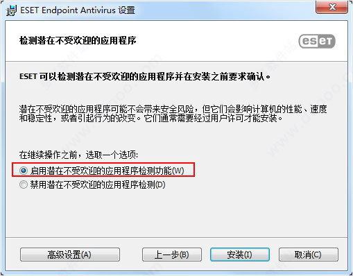 4、选择第一项:启用潜在不受欢迎的应用程序检测功能;
