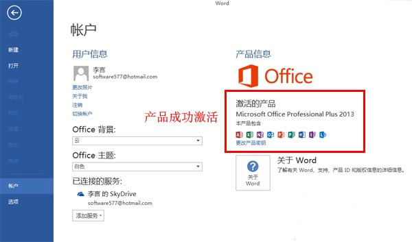 3、再次打开word2013,软件已经显示为“激活的产品”。