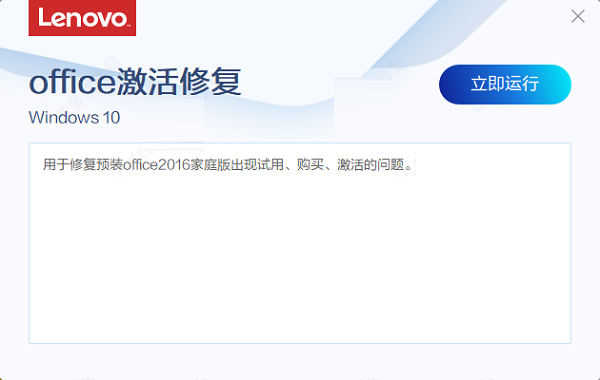 联想office激活修复工具是由联想售后工程师研发的一款联想电脑自带office修复应用程序,它能够帮助用户解决预装office2016家庭版出现试用购买等激活问题,支持自动检测故障的原因并为您解决故障,让您可以正常的启动office2016,恢复office的正常工作状态给你提供稳定、安全的办公体验!