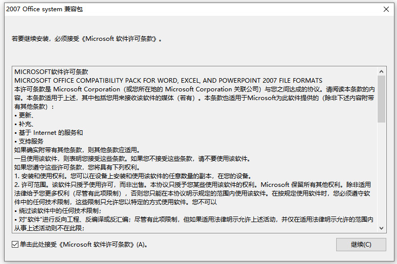 注意:请确保您的系统是最新的,即安装了Microsoft Update上所有高优先级或必选的更新(Microsoft Office XP和2003用户必须满足此条件),然后才能安装microsoft office 2007兼容包程序。